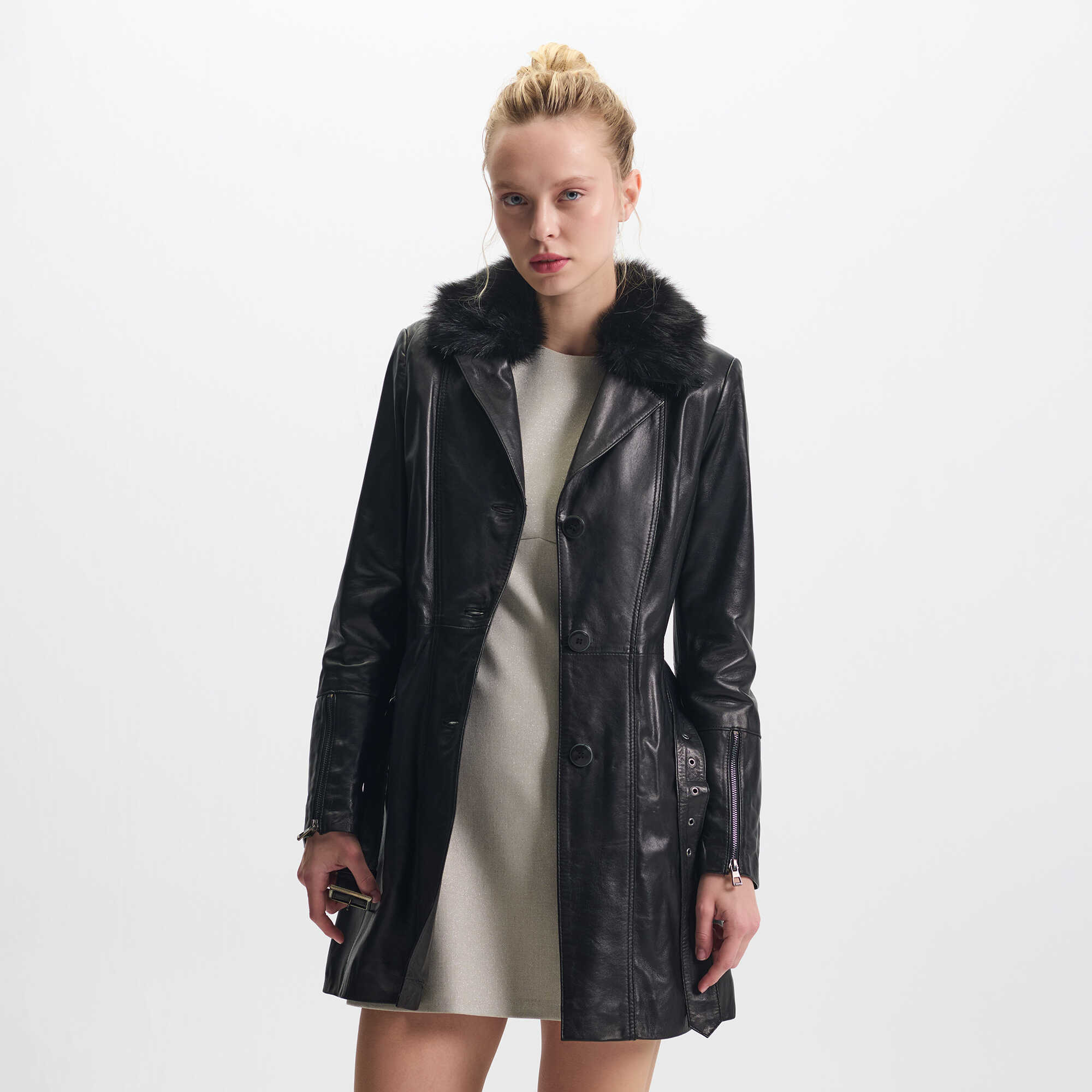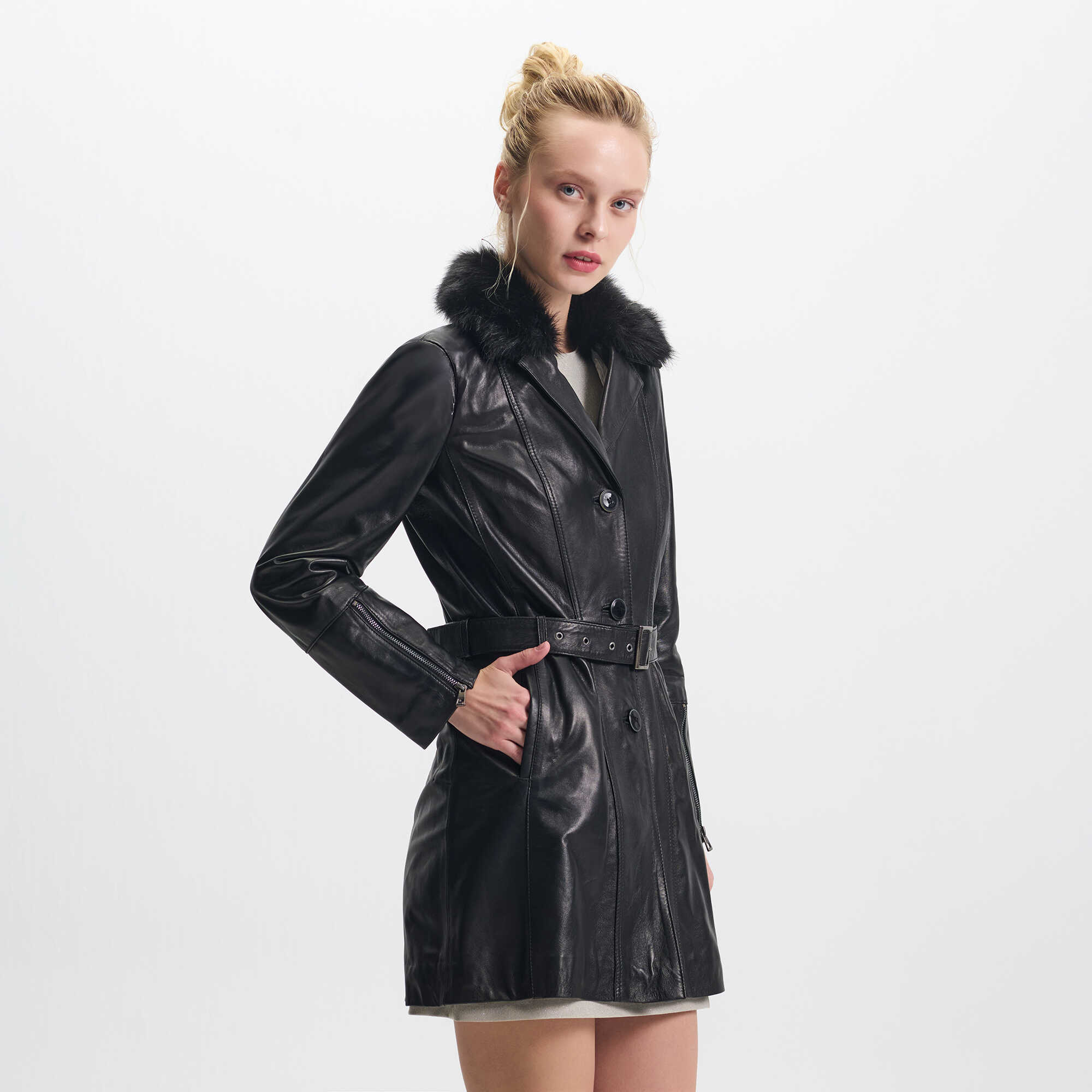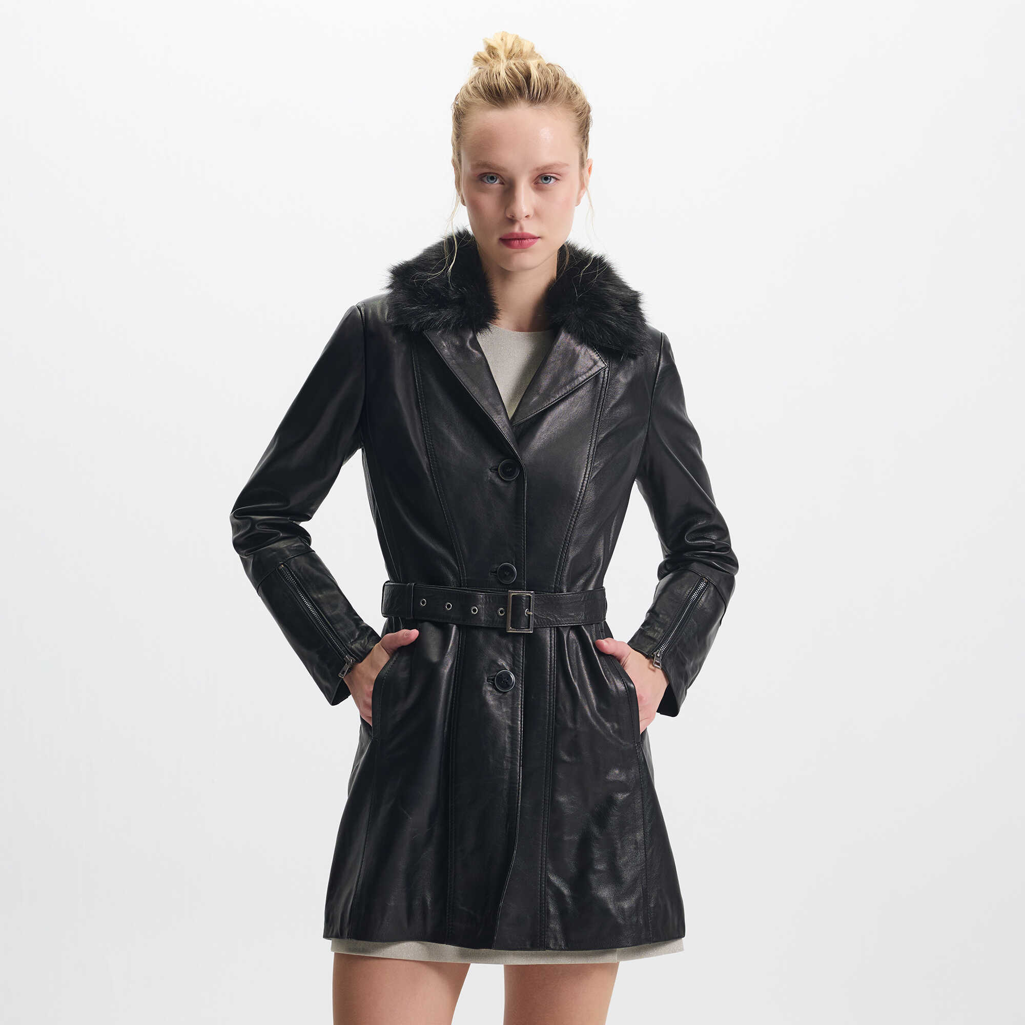 Siyah Hakiki Deri Kadın Deri Trençkot - K25KDM320476-Q3H